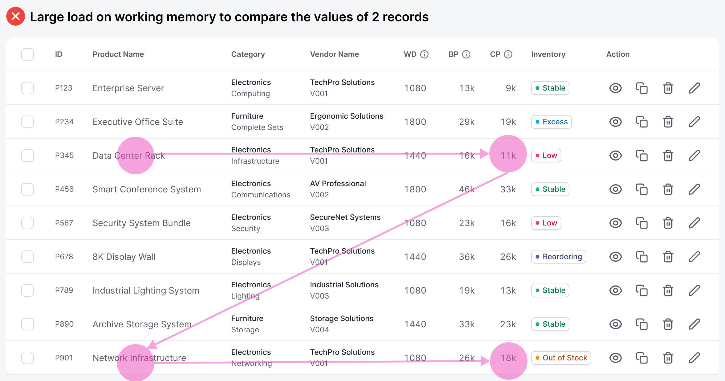 Imagine you're tasked to analyze the relationships and patterns of a data table. What seems like a simple task becomes a cognitive nightmare when the working memory is overwhelmed. Users often experience this as they compare data from multiple table rows.