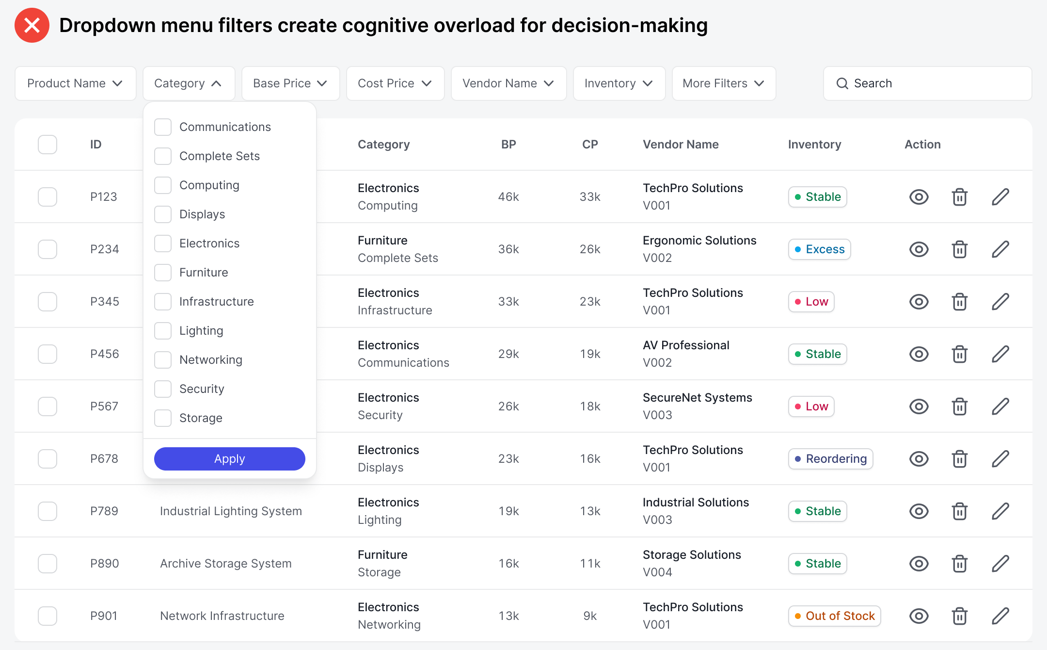 Unfortunately, most applications have poorly designed filters that result in cognitive overload. The most common approach is to place multiple dropdown menus above the table. However, users become overwhelmed when they see too many choices and take longer to decide.