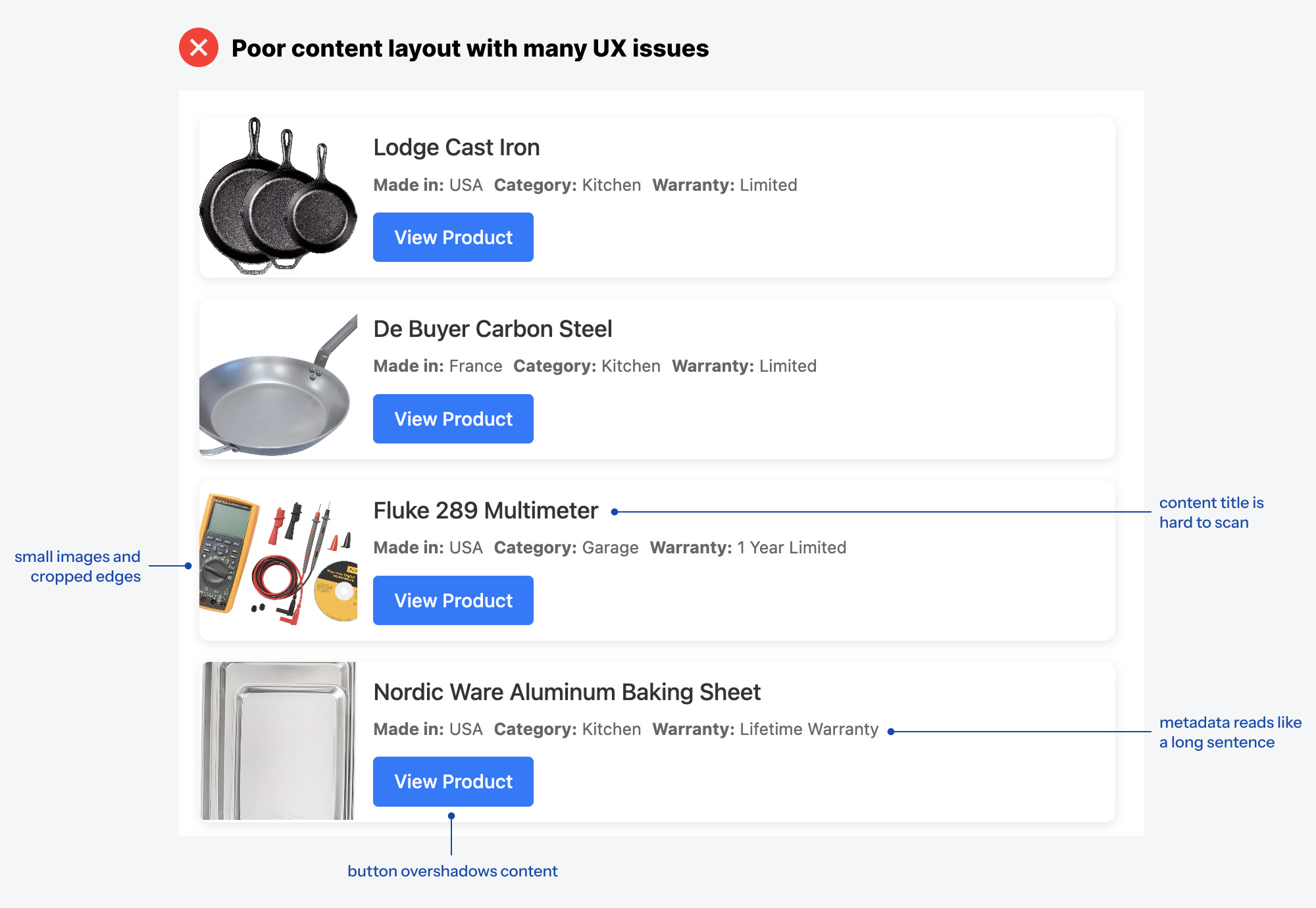 Without a proper card layout, your content will continue to suffer. Here's an example of how not to design a card layout. Notice how the button dominates the visuals and overshadows the information. The thumbnails are small and cropped on the edges. The title is difficult to scan, and the metadata reads like one long sentence.