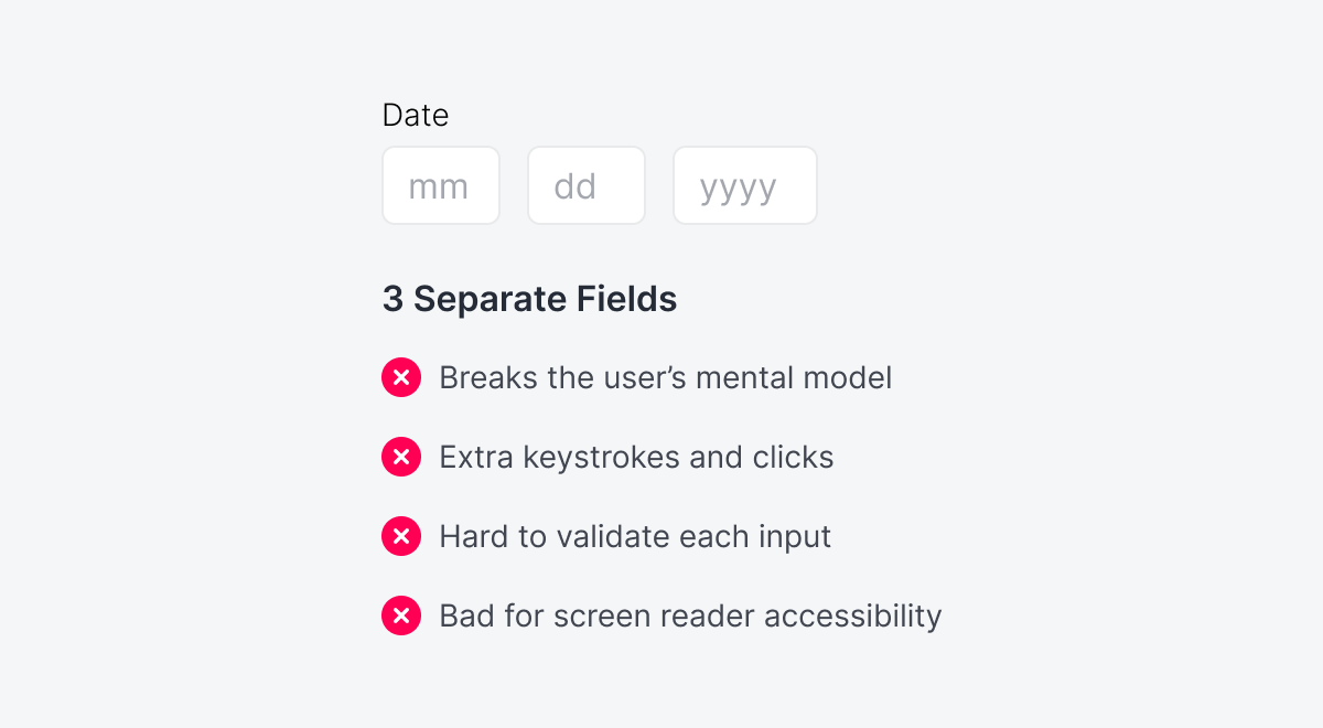 Separating the date input into three fields increases cognitive load with no real benefit. Most users think of a date as a single entity, so fragmenting it into month, day, and year fields breaks that mental model and forces artificial pauses mid-entry.