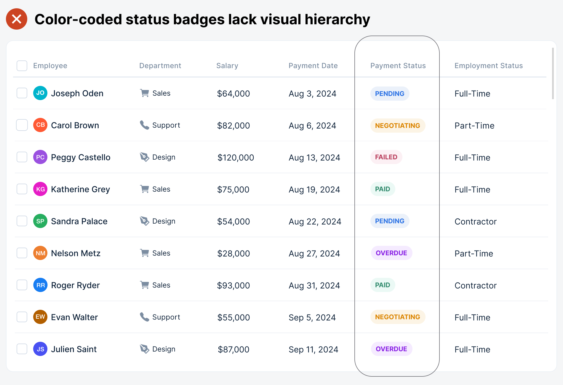 Almost every table uses badges to indicate different statuses to users. Status badges alert them to which specific data they need to act on or be aware of. However, a big UX problem is that it's hard to differentiate the meaning and priority of these statuses.